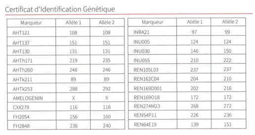L’exemple ci-dessous montre une empreinte génétique établie selon le code ISAG 2006 (22 marqueurs.)